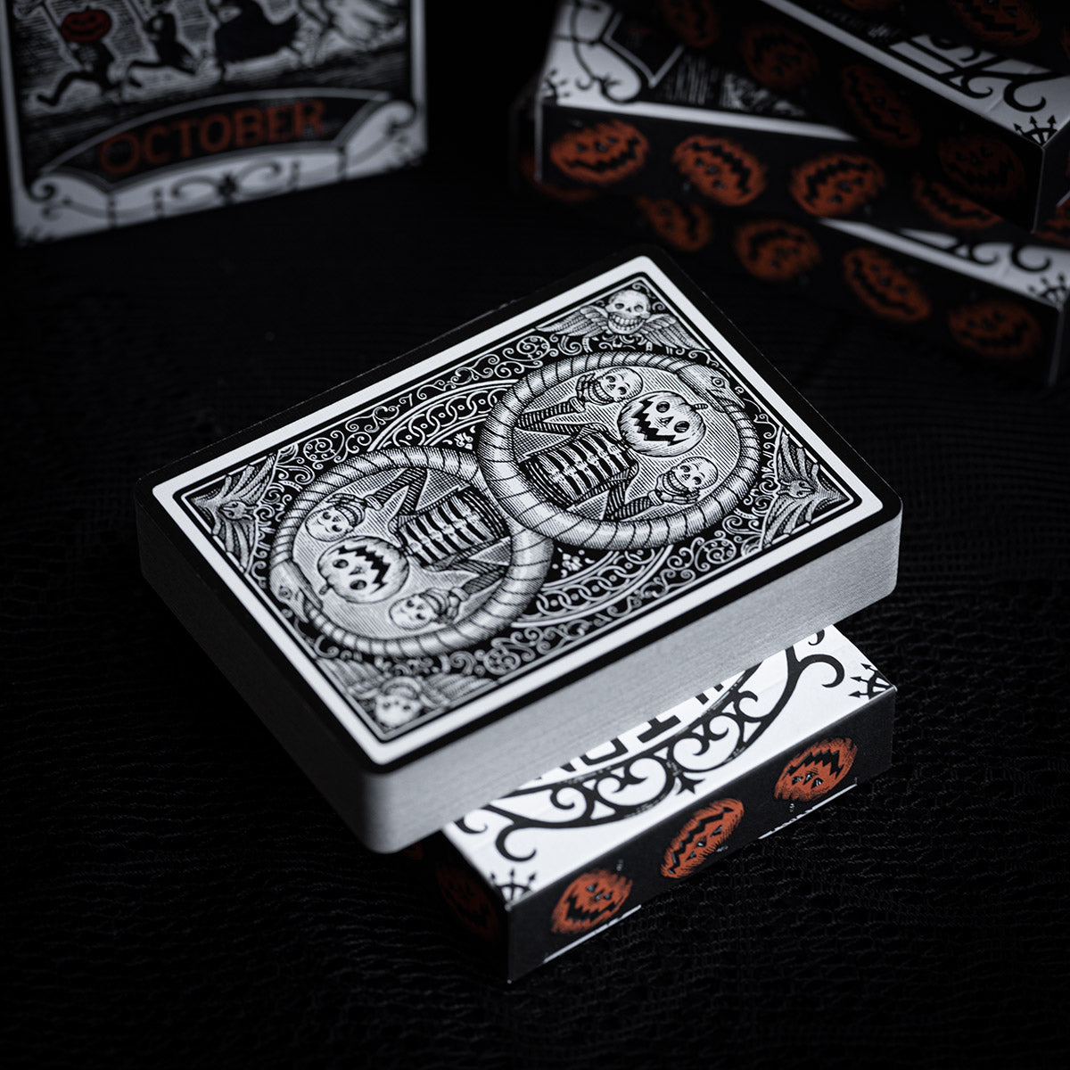 These MIXED PROCESS decks were hand made by Brad Fulton using vintage comic books from his collection to share the true spirit of Halloween. These are hand painted backgrounds with sealed comic book illustrations hand applied. Each hand collaged deck is signed “Fulton 1/1” on the side of the tuck box. Inside is a complete deck of 2025 October V2 Playing Cards.