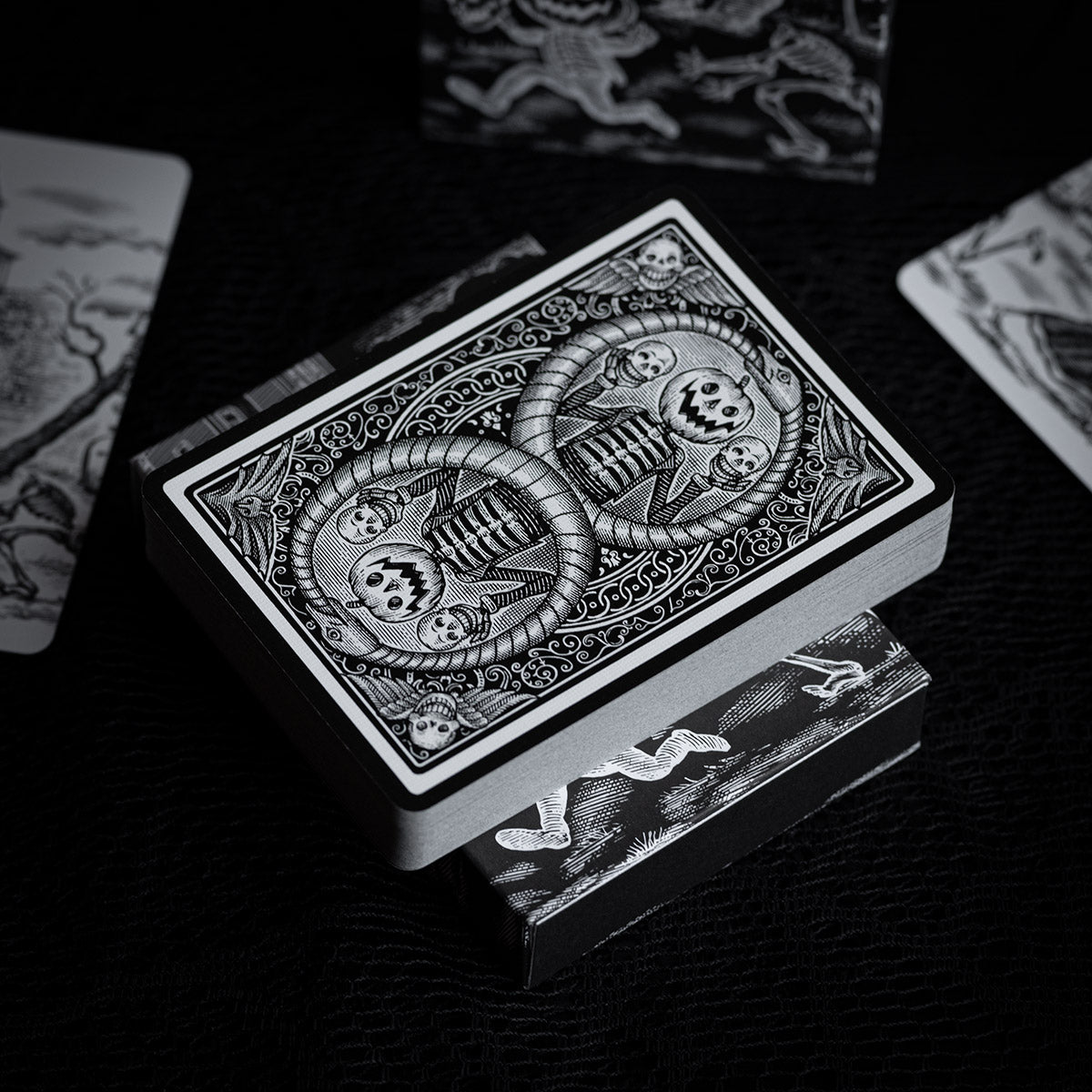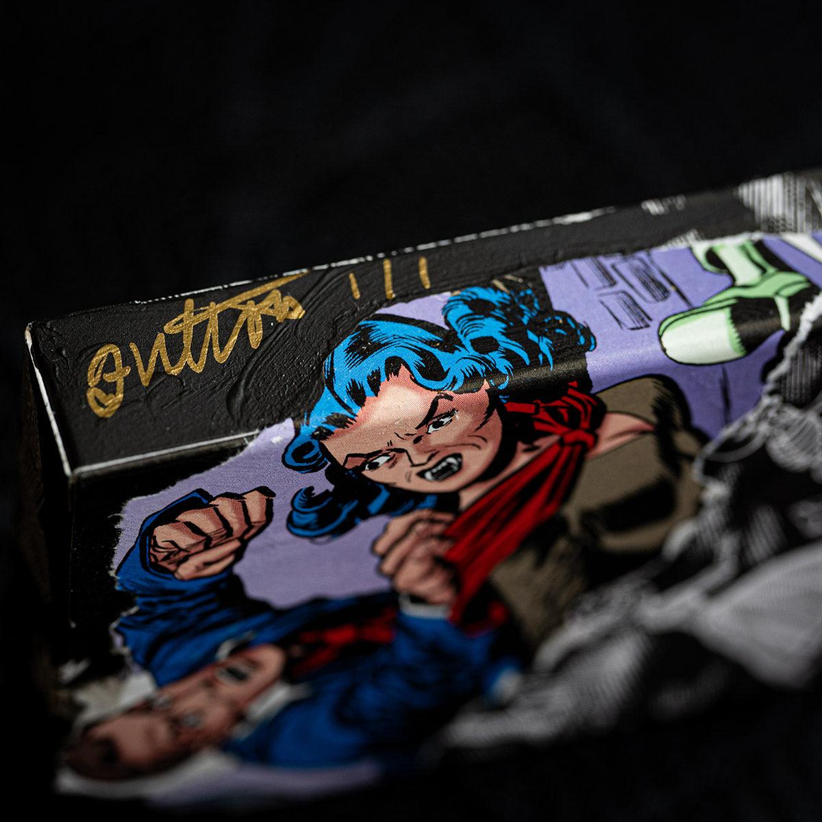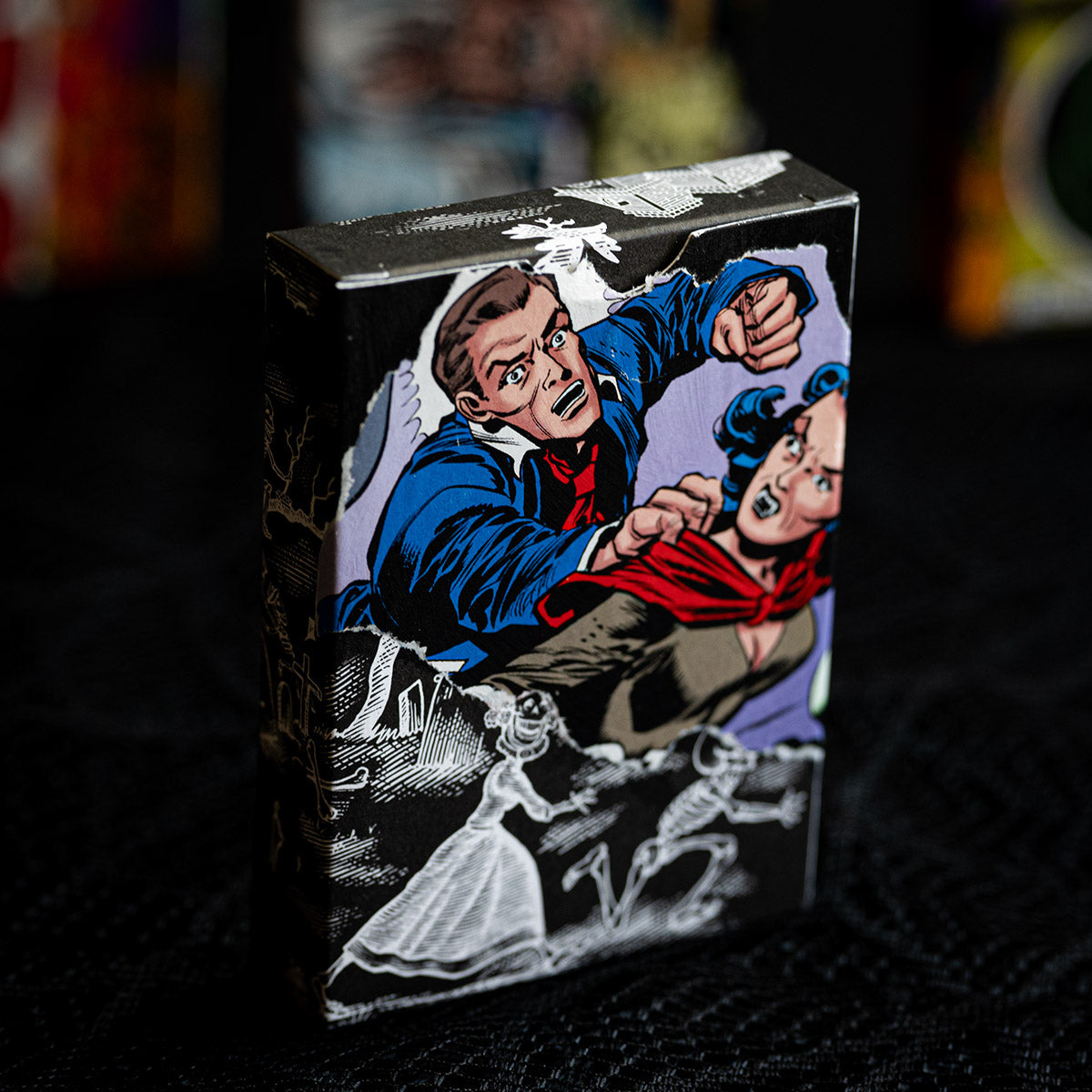These MIXED PROCESS decks were hand made by Brad Fulton using vintage comic books from his collection to share the true spirit of Halloween. These are hand painted backgrounds with sealed comic book illustrations hand applied. Each hand collaged deck is signed “Fulton 1/1” on the side of the tuck box. Inside is a complete deck of 2025 October V2 PLAYING CARDS