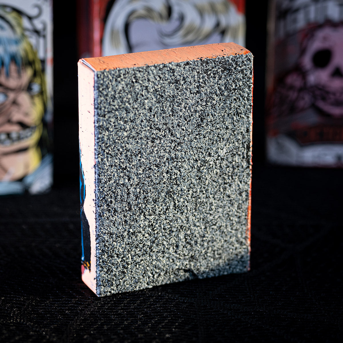 These MIXED PROCESS decks were hand made by Brad Fulton using vintage comic books from his collection to share the true spirit of Halloween. These are hand painted backgrounds with sealed comic book illustrations hand applied. Each hand collaged deck is signed “Fulton 1/1” on the side of the tuck box. Inside is a complete deck of 2025 October Tombstone Grey Playing Cards.