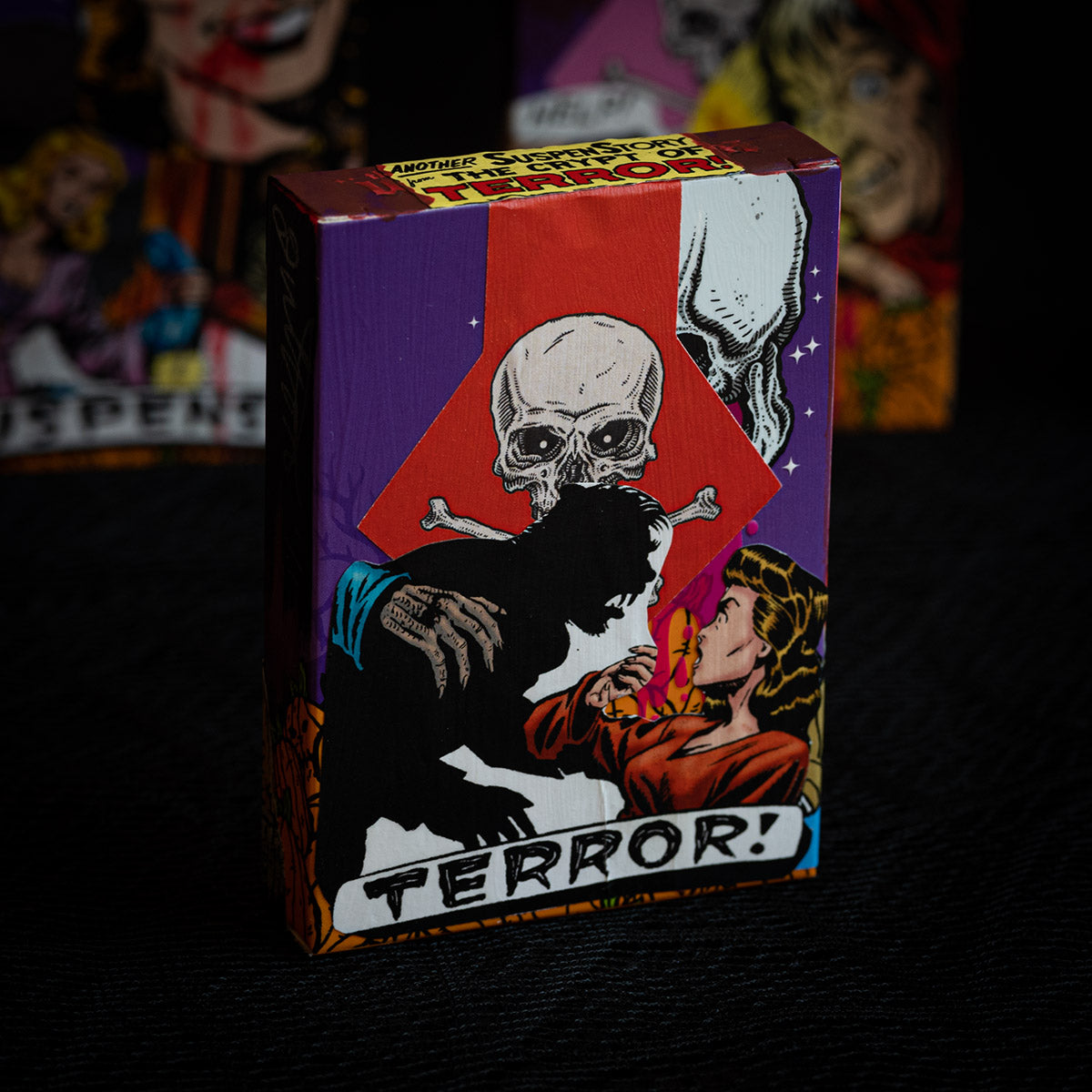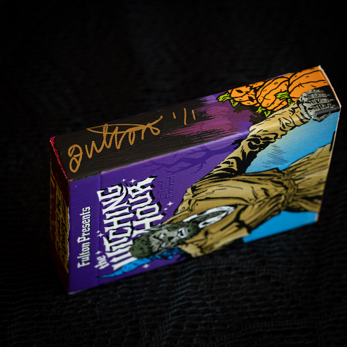 These MIXED PROCESS decks were hand made by Brad Fulton using vintage comic books from his collection to share the true spirit of Halloween. These are hand painted backgrounds with sealed comic book illustrations hand applied. Each hand collaged deck is signed “Fulton 1/1” on the side of the tuck box. Inside is a complete deck of 2025 WITCHING HOUR Playing Cards.