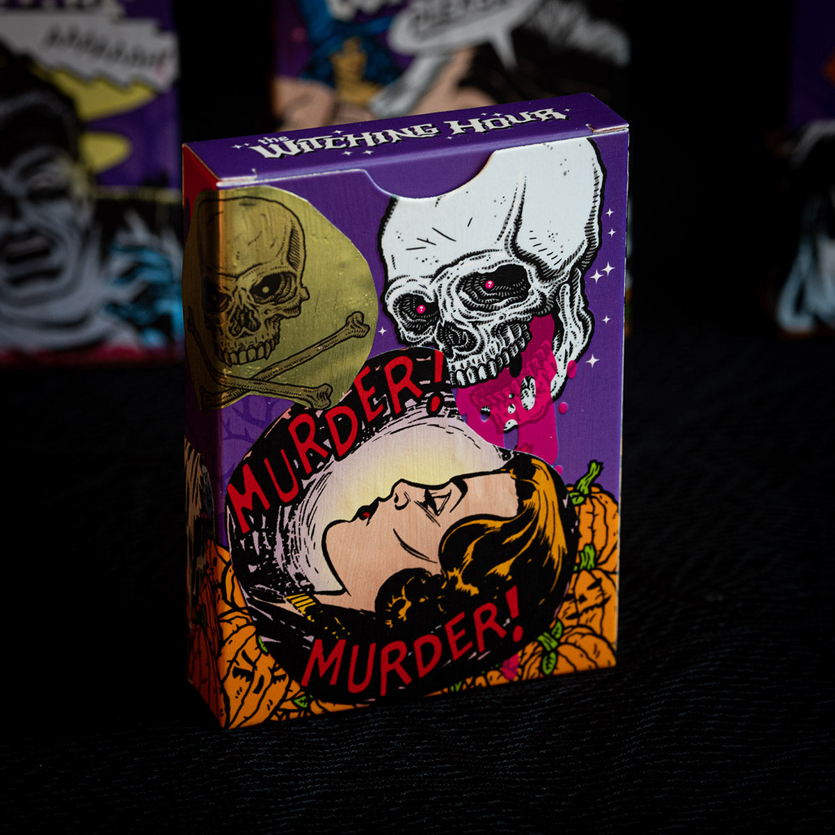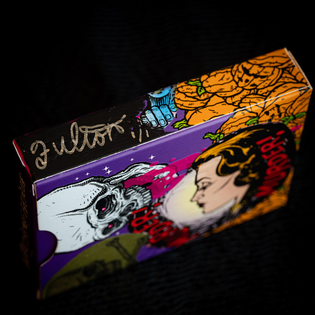 These MIXED PROCESS decks were hand made by Brad Fulton using vintage comic books from his collection to share the true spirit of Halloween. These are hand painted backgrounds with sealed comic book illustrations hand applied. Each hand collaged deck is signed “Fulton 1/1” on the side of the tuck box. Inside is a complete deck of 2025 WITCHING HOUR Playing Cards.
