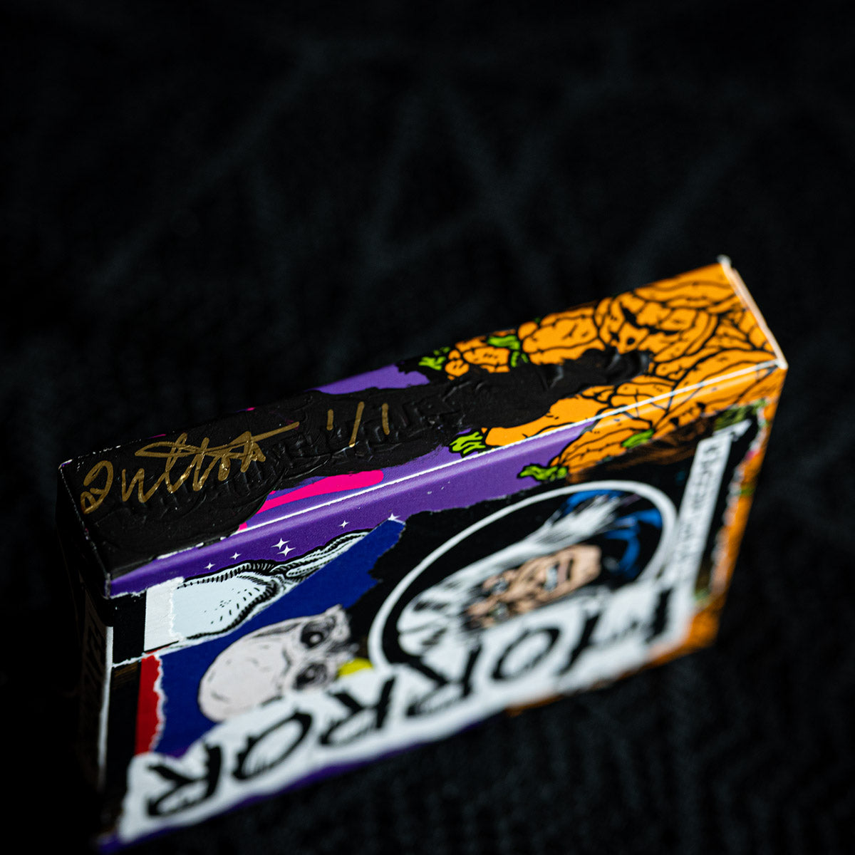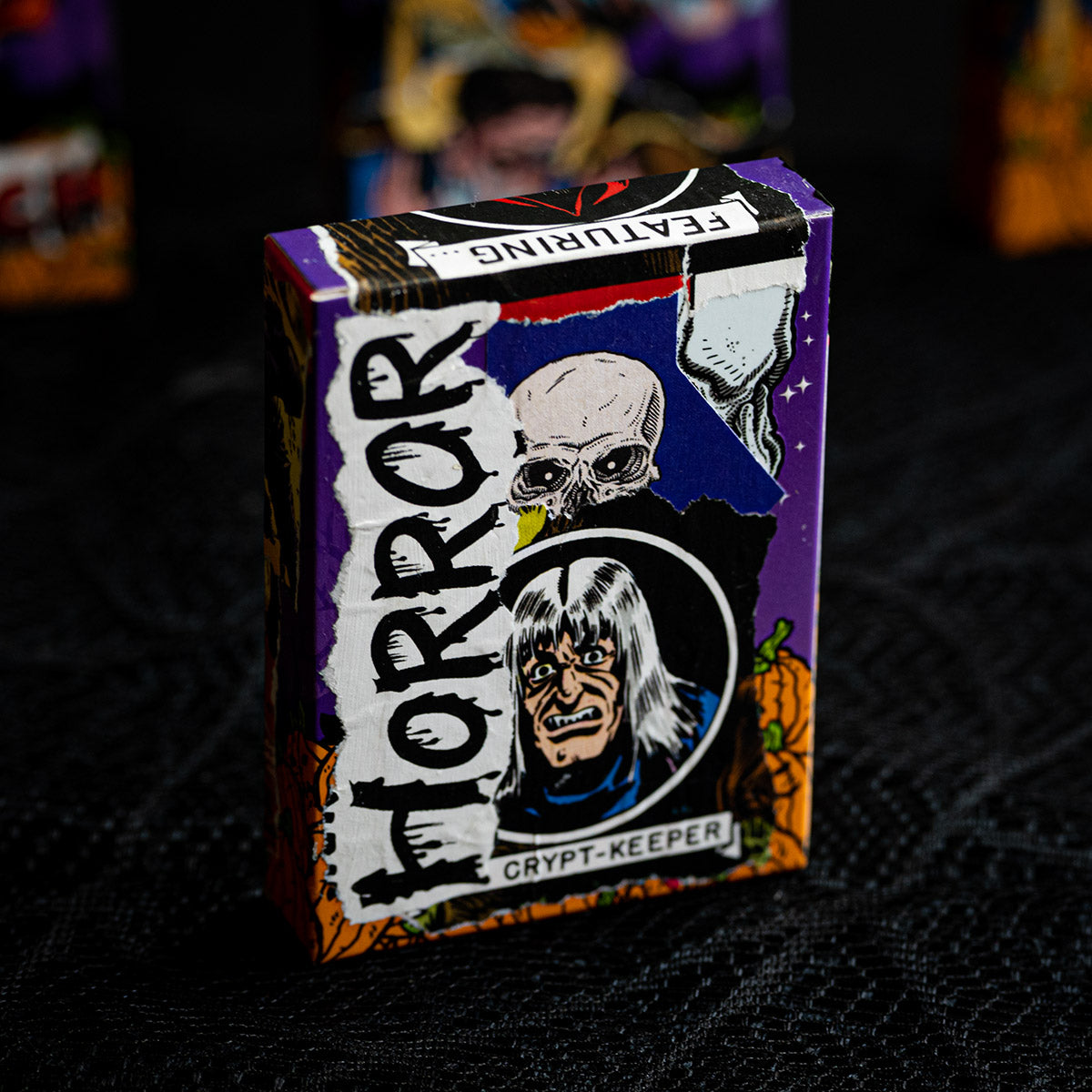 These MIXED PROCESS decks were hand made by Brad Fulton using vintage comic books from his collection to share the true spirit of Halloween. These are hand painted backgrounds with sealed comic book illustrations hand applied. Each hand collaged deck is signed “Fulton 1/1” on the side of the tuck box. Inside is a complete deck of 2025 WITCHING HOUR Playing Cards.