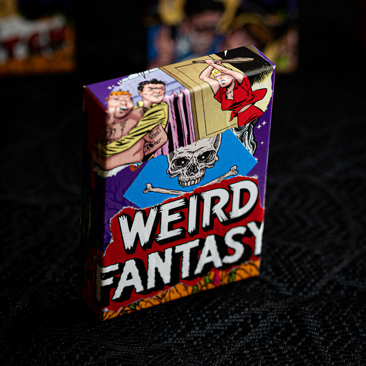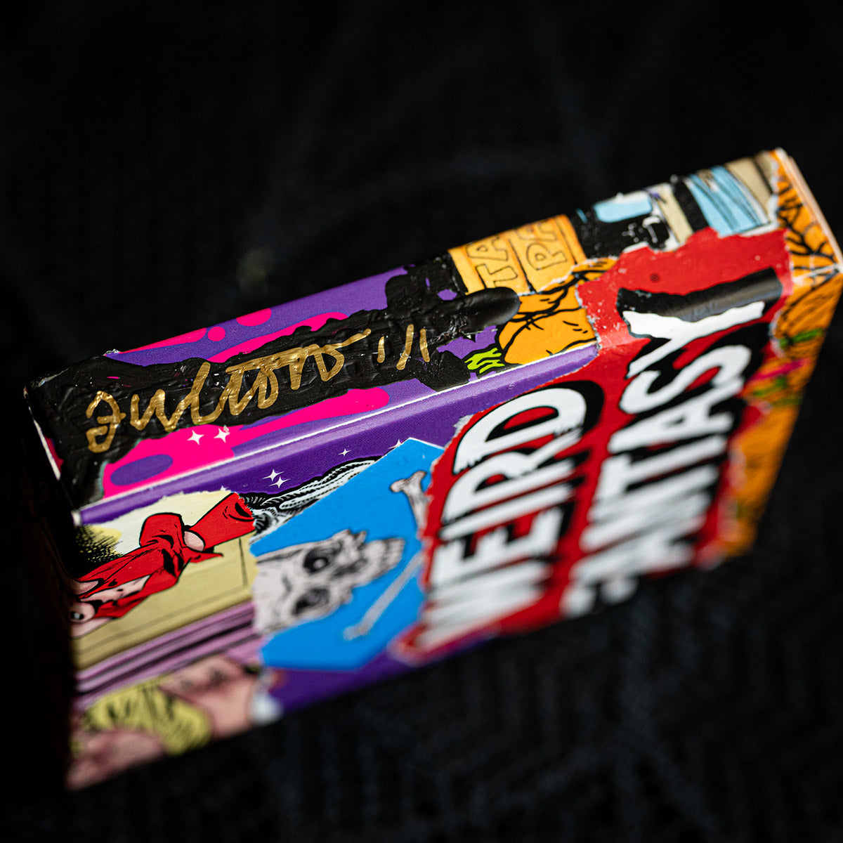 These MIXED PROCESS decks were hand made by Brad Fulton using vintage comic books from his collection to share the true spirit of Halloween. These are hand painted backgrounds with sealed comic book illustrations hand applied. Each hand collaged deck is signed “Fulton 1/1” on the side of the tuck box. Inside is a complete deck of 2025 WITCHING HOUR Playing Cards.