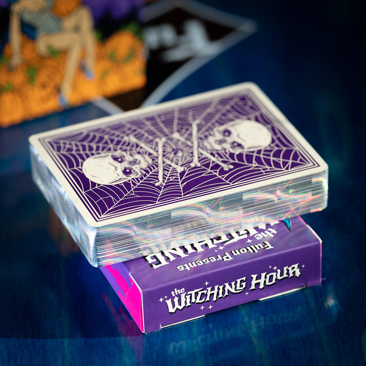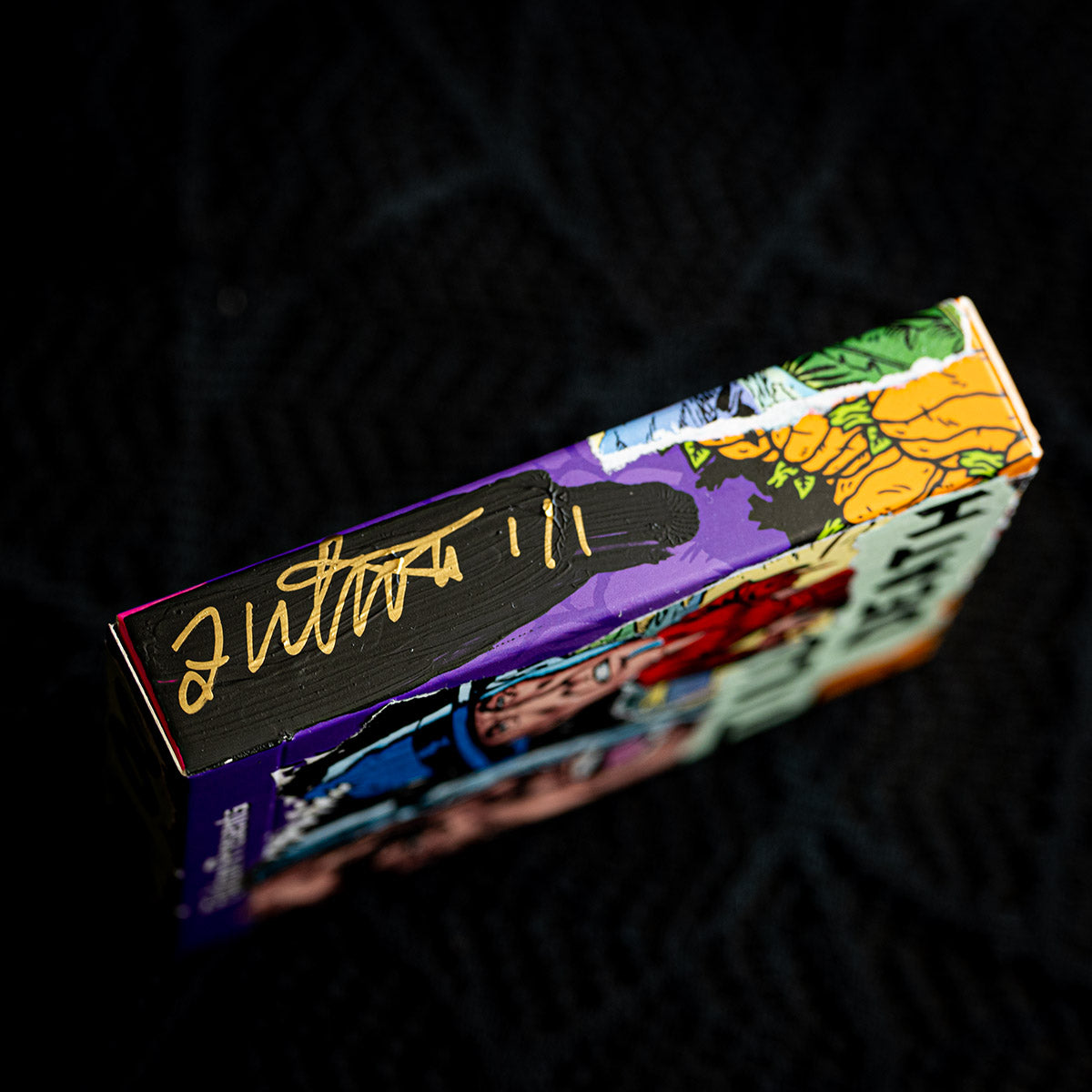 These MIXED PROCESS decks were hand made by Brad Fulton using vintage comic books from his collection to share the true spirit of Halloween. These are hand painted backgrounds with sealed comic book illustrations hand applied. Each hand collaged deck is signed “Fulton 1/1” on the side of the tuck box. Inside is a complete deck of 2025 WITCHING HOUR Playing Cards.