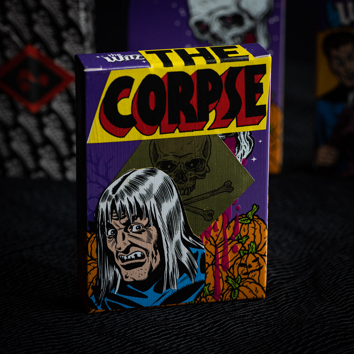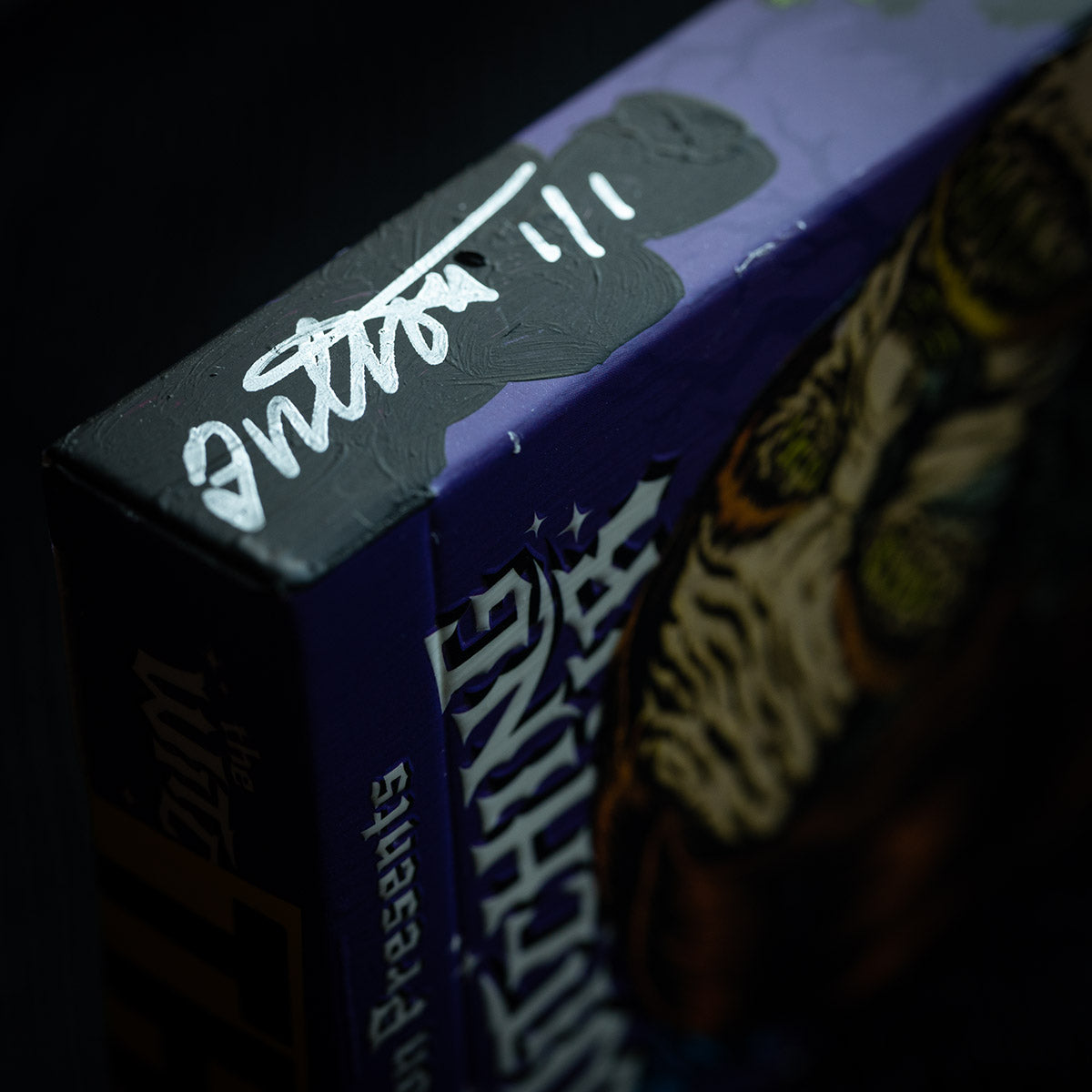 These MIXED PROCESS decks were hand made by Brad Fulton using vintage comic books from his collection to share the true spirit of Halloween. These are hand painted backgrounds with sealed comic book illustrations hand applied. Each hand collaged deck is signed “Fulton 1/1” on the side of the tuck box. Inside is a complete deck of 2025 WITCHING HOUR Playing Cards.