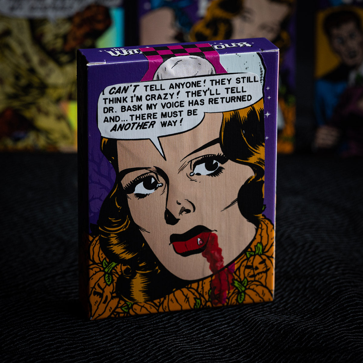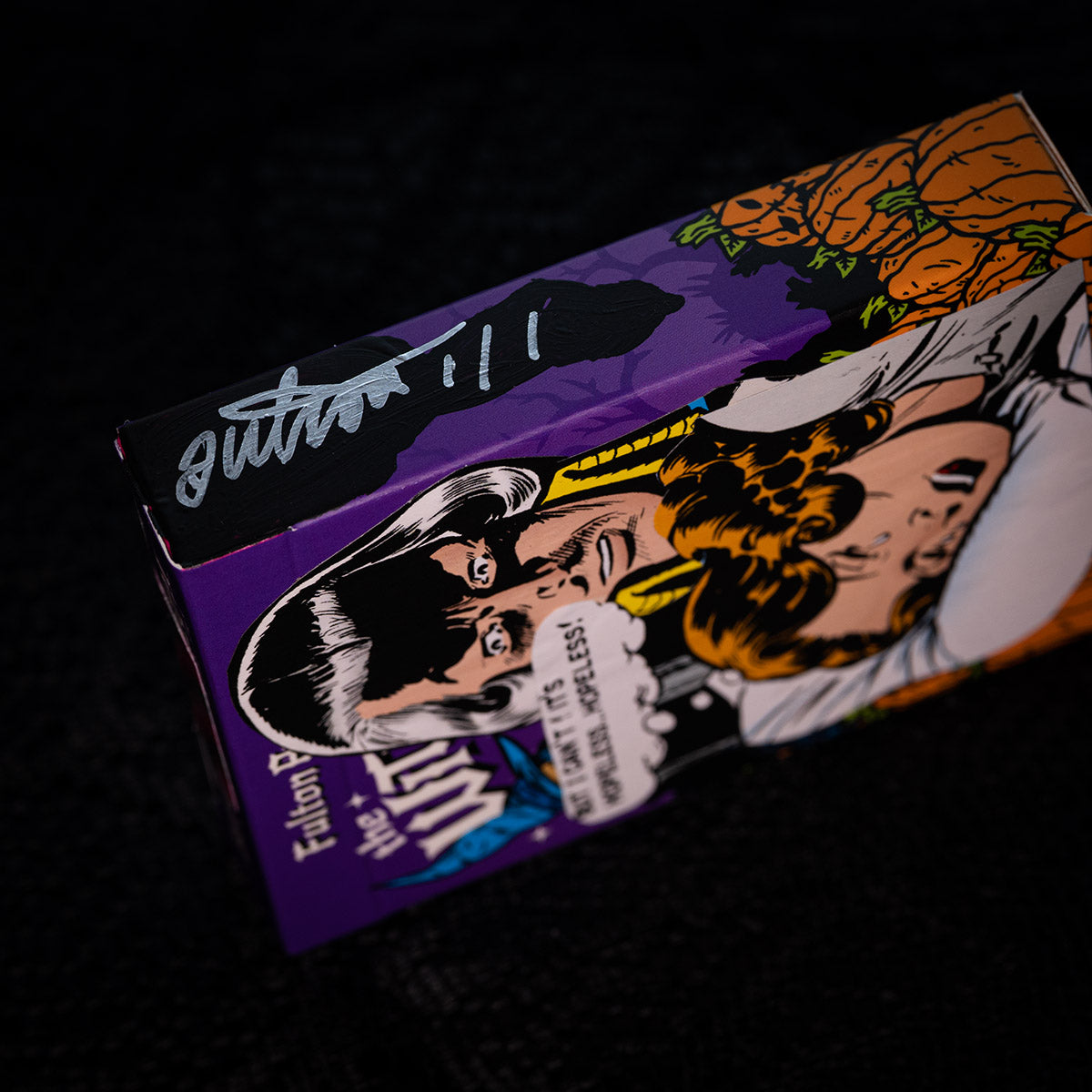 These MIXED PROCESS decks were hand made by Brad Fulton using vintage comic books from his collection to share the true spirit of Halloween. These are hand painted backgrounds with sealed comic book illustrations hand applied. Each hand collaged deck is signed “Fulton 1/1” on the side of the tuck box. Inside is a complete deck of 2025 WITCHING HOUR Playing Cards.