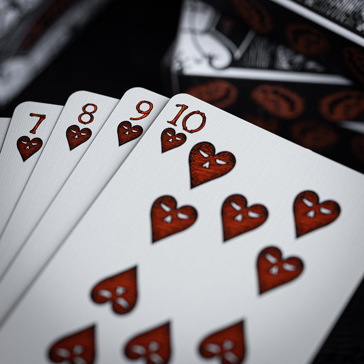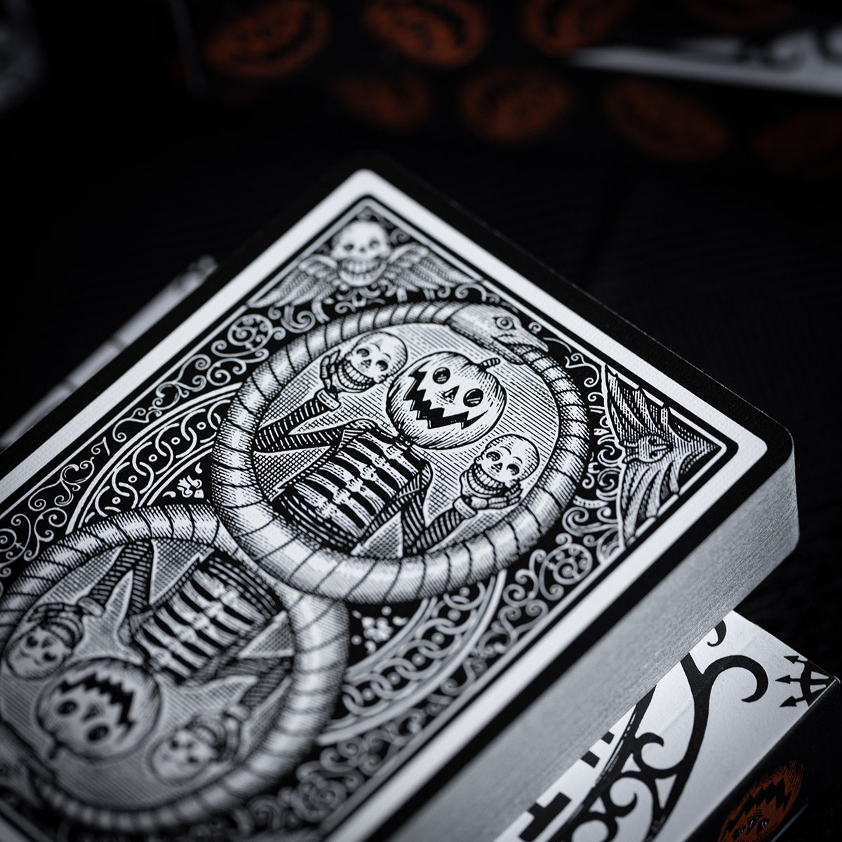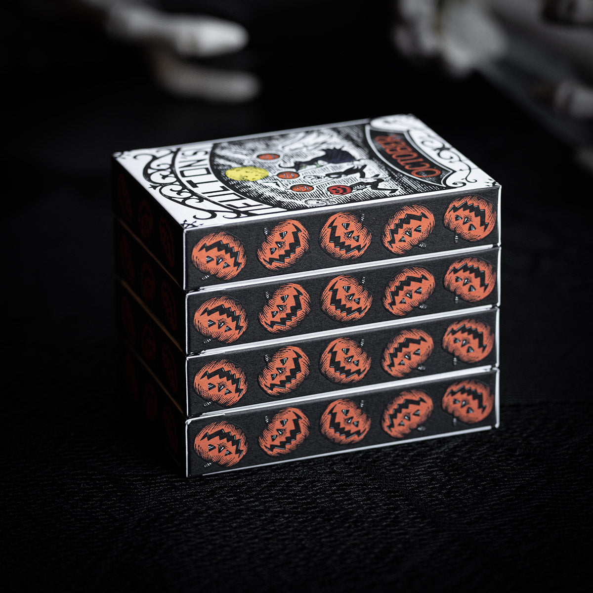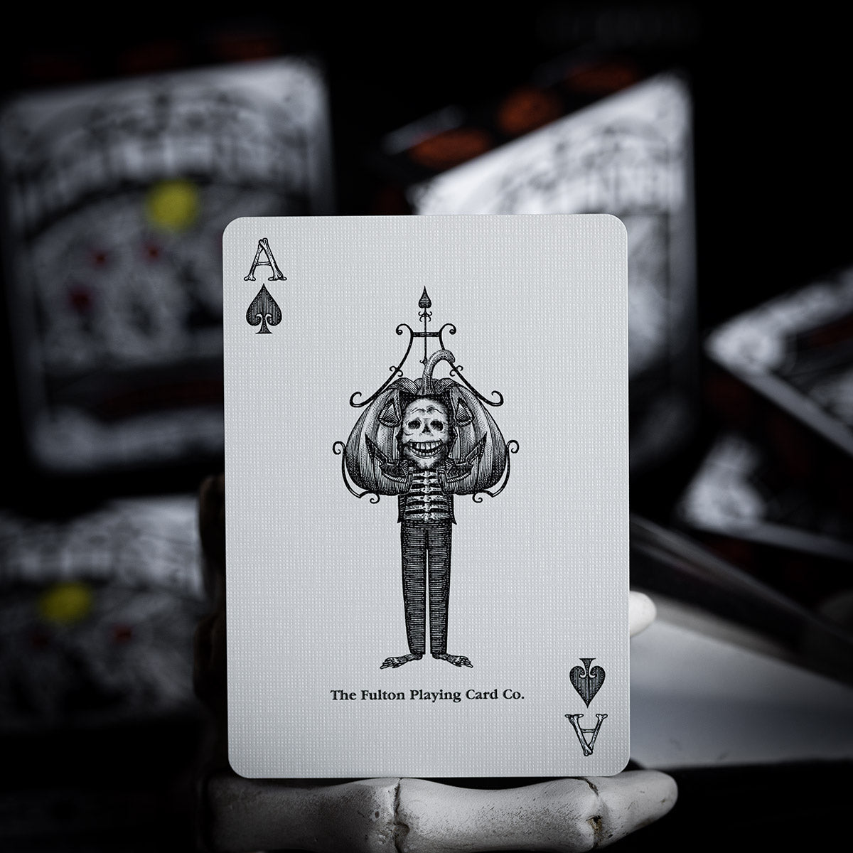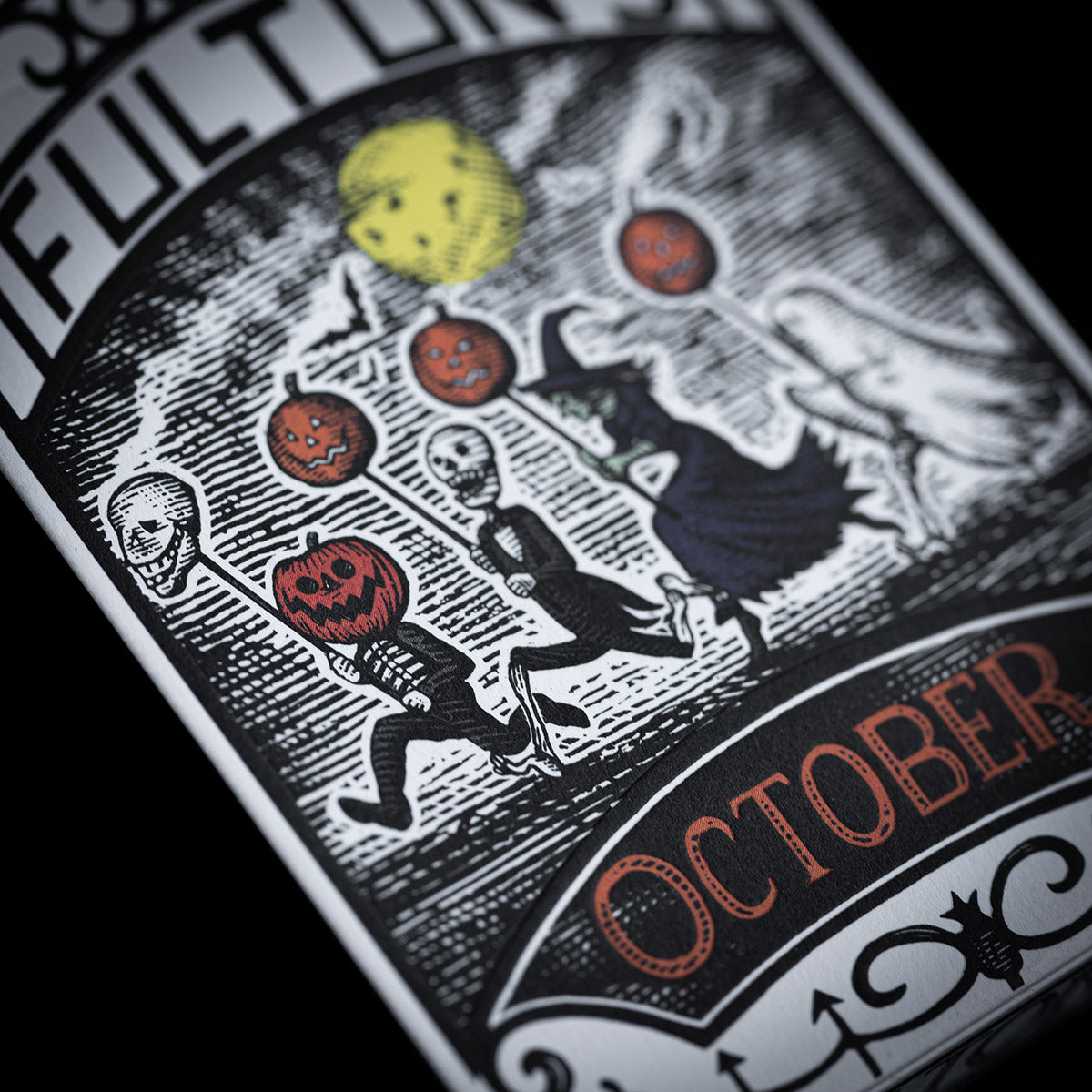 This first edition of October V2 features a striking black-bordered card back featuring our favorite Jack-O-Lantern prominently displayed holding his old friends. Every number and letter on the number cards was hand illustrated by Noble using a bone-like new Fulton Font. This is the best the October Universe has ever looked.