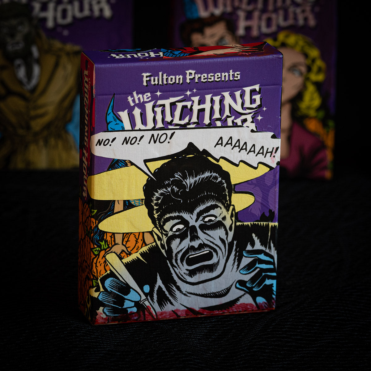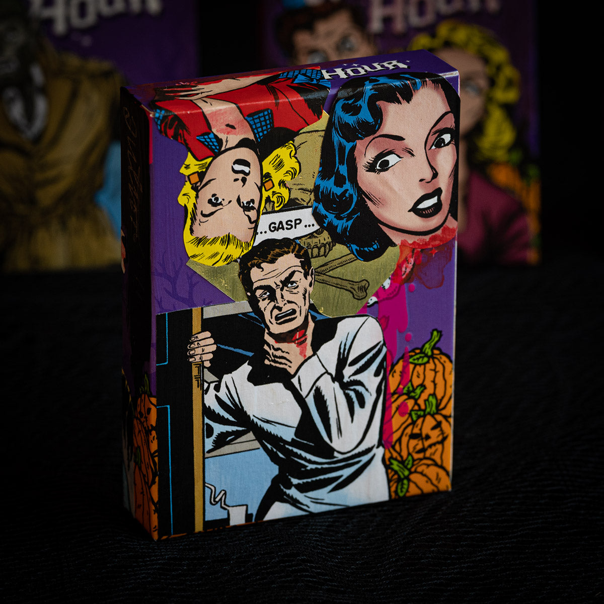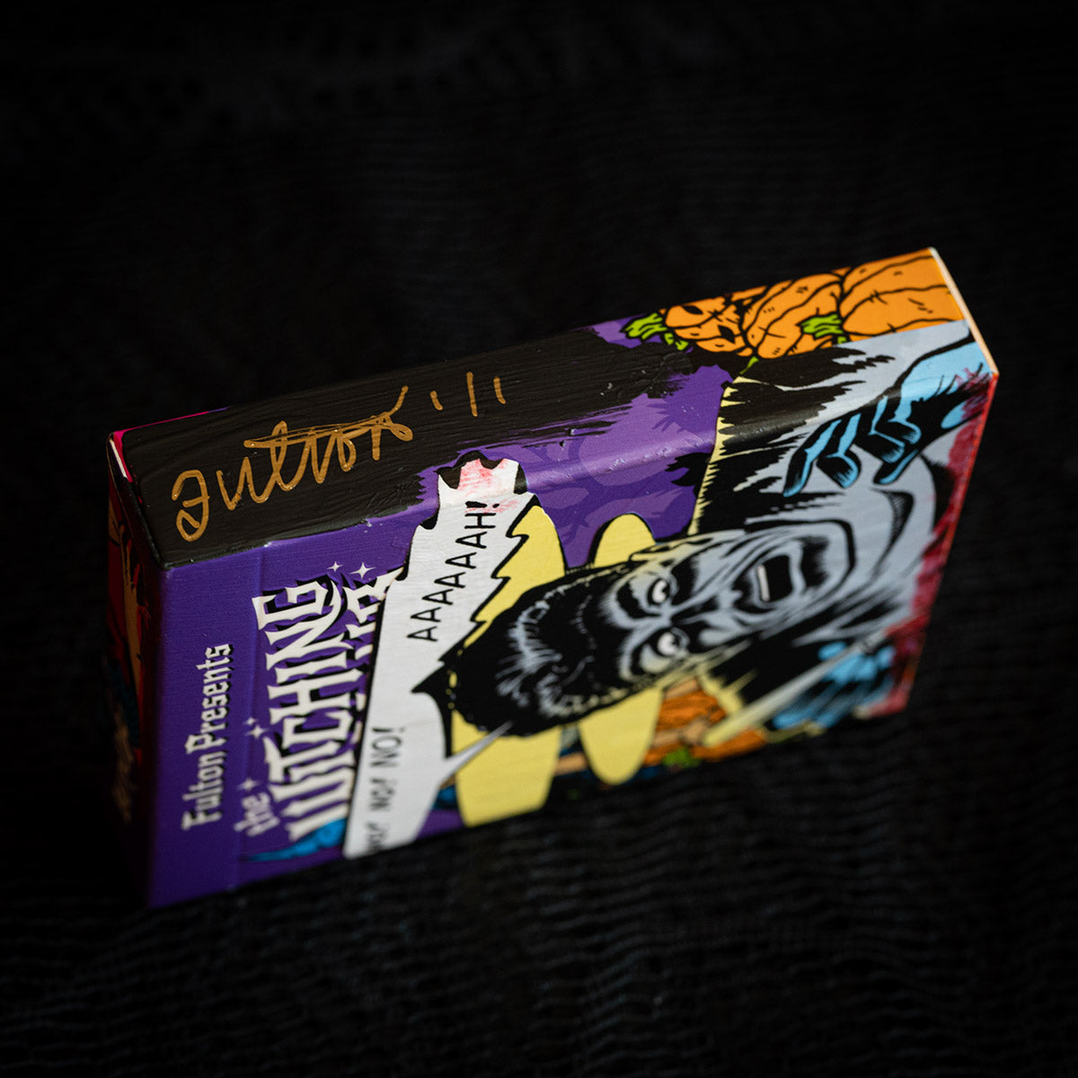 These MIXED PROCESS decks were hand made by Brad Fulton using vintage comic books from his collection to share the true spirit of Halloween. These are hand painted backgrounds with sealed comic book illustrations hand applied. Each hand collaged deck is signed “Fulton 1/1” on the side of the tuck box. Inside is a complete deck of 2025 WITCHING HOUR Playing Cards.