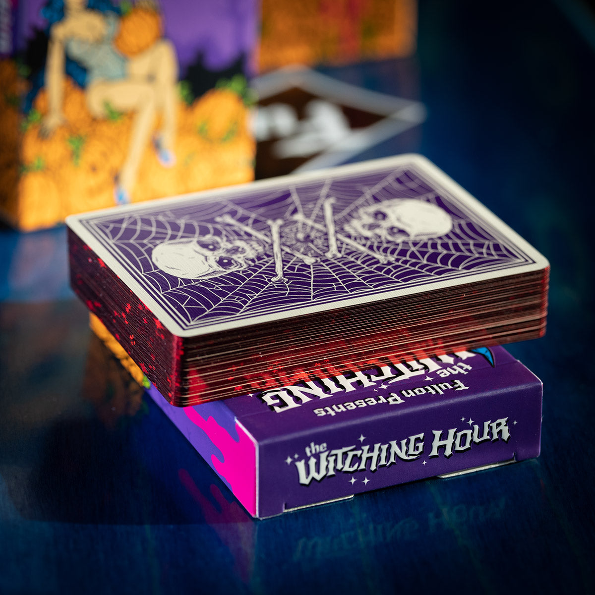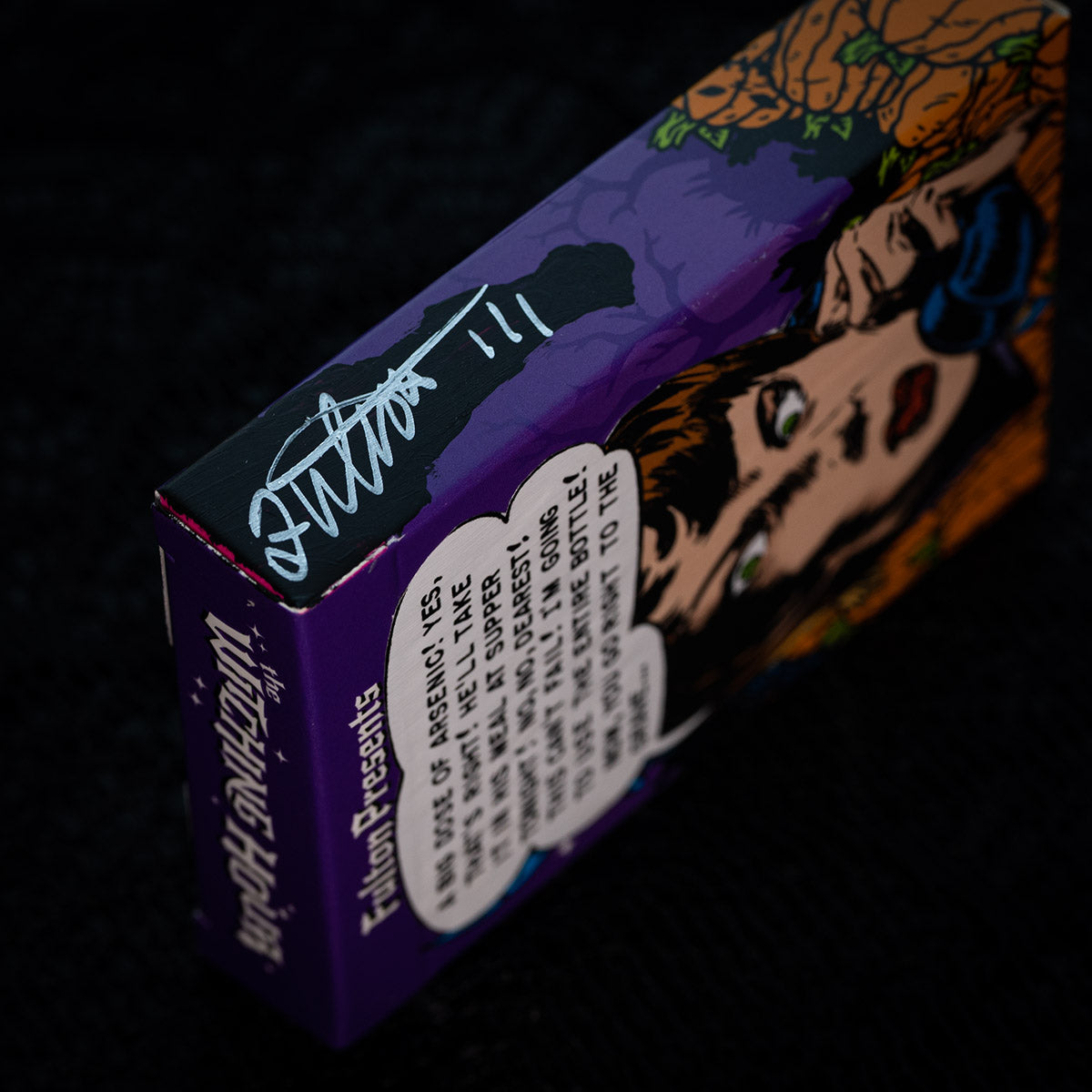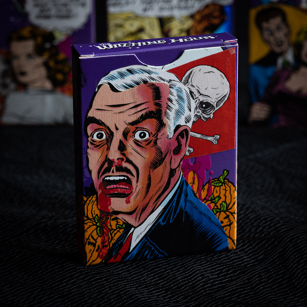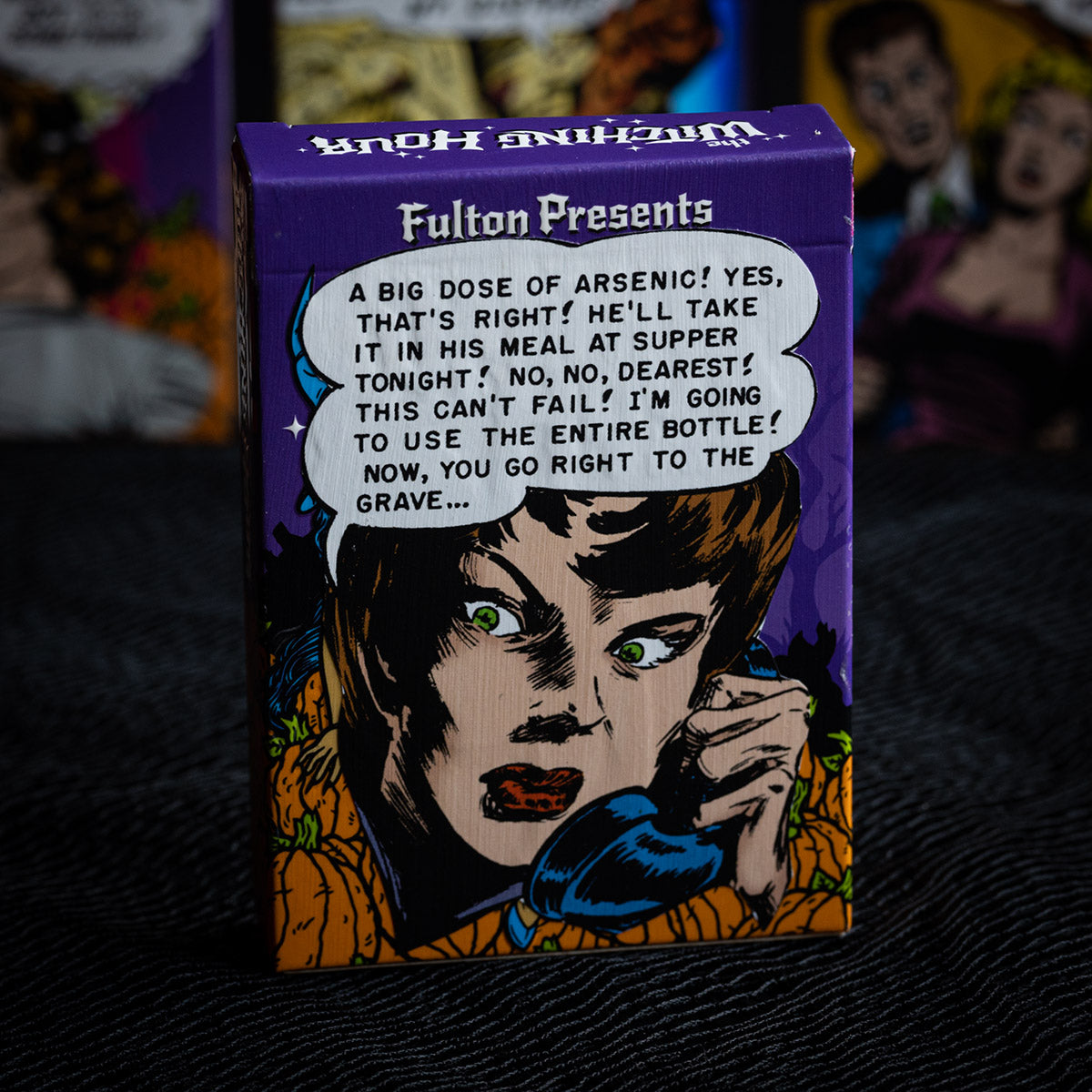 These MIXED PROCESS decks were hand made by Brad Fulton using vintage comic books from his collection to share the true spirit of Halloween. These are hand painted backgrounds with sealed comic book illustrations hand applied. Each hand collaged deck is signed “Fulton 1/1” on the side of the tuck box. Inside is a complete deck of 2025 WITCHING HOUR Playing Cards.